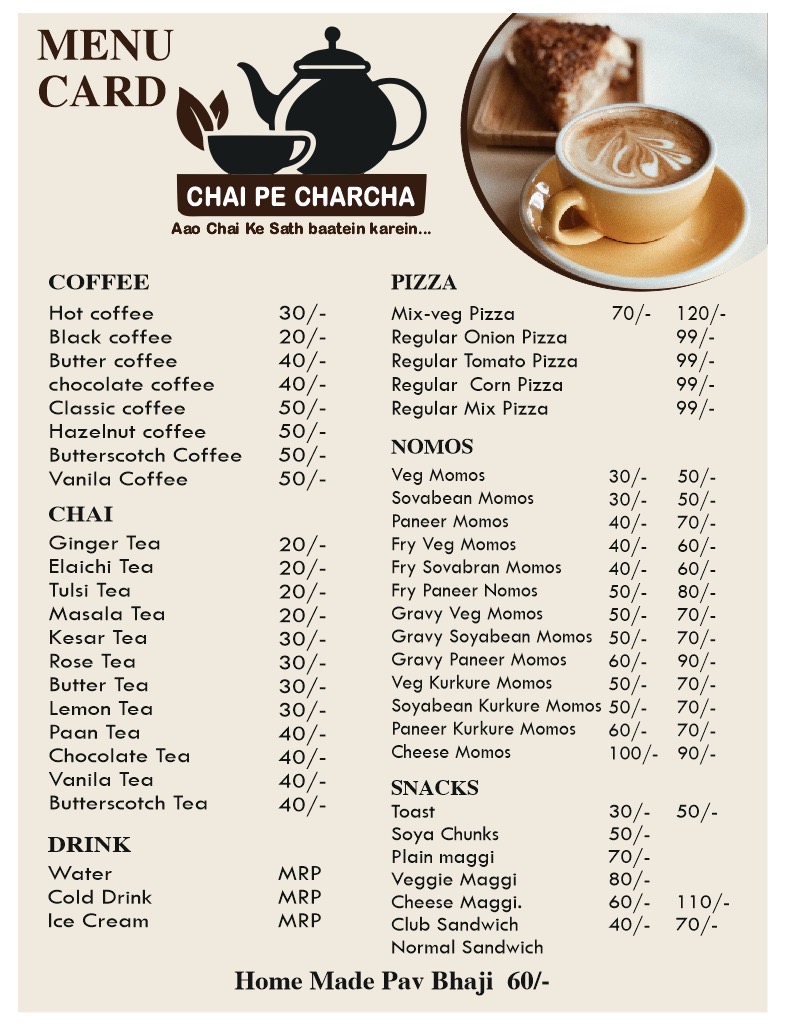 Welcome to Chai pe Charcha, a delightful cafe nestled in Chaudhary Harkesh Market, Karawal Nagar. This vibrant spot is a haven for chai lovers, offering an impressive array of teas, including Ginger, Masala, and the unique Rose Tea, all priced affordably at ₹20-30.